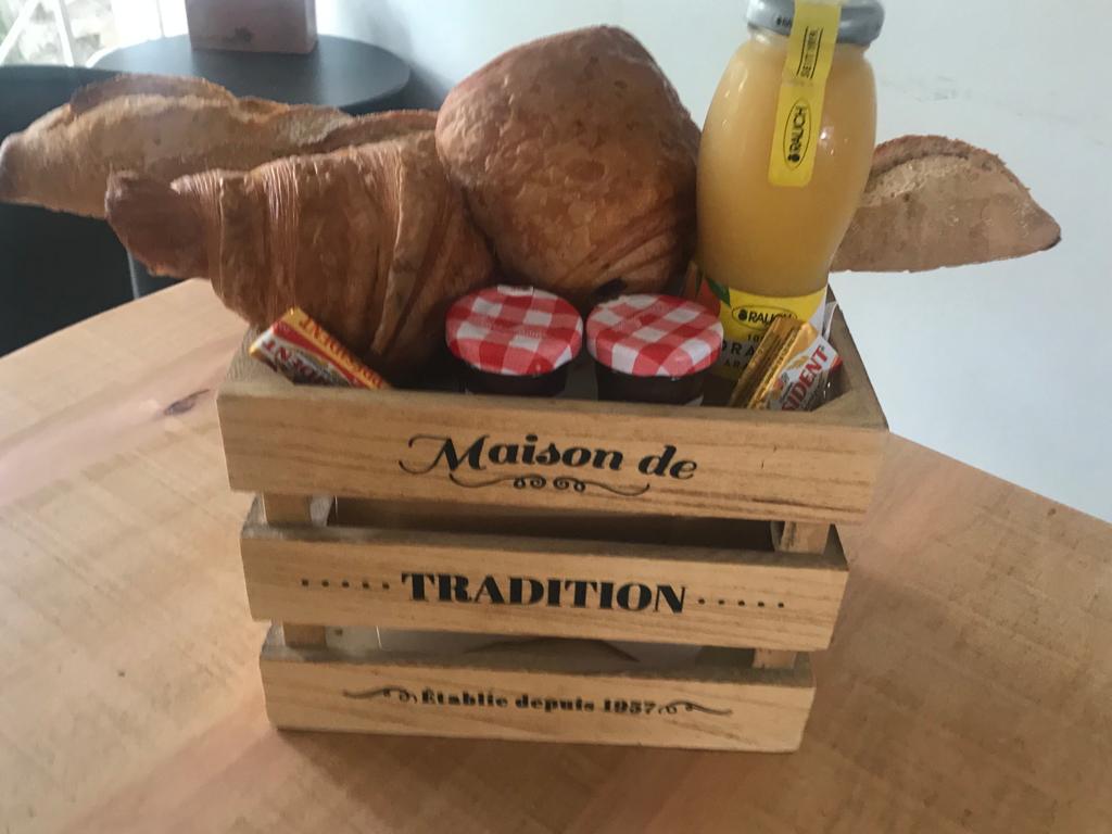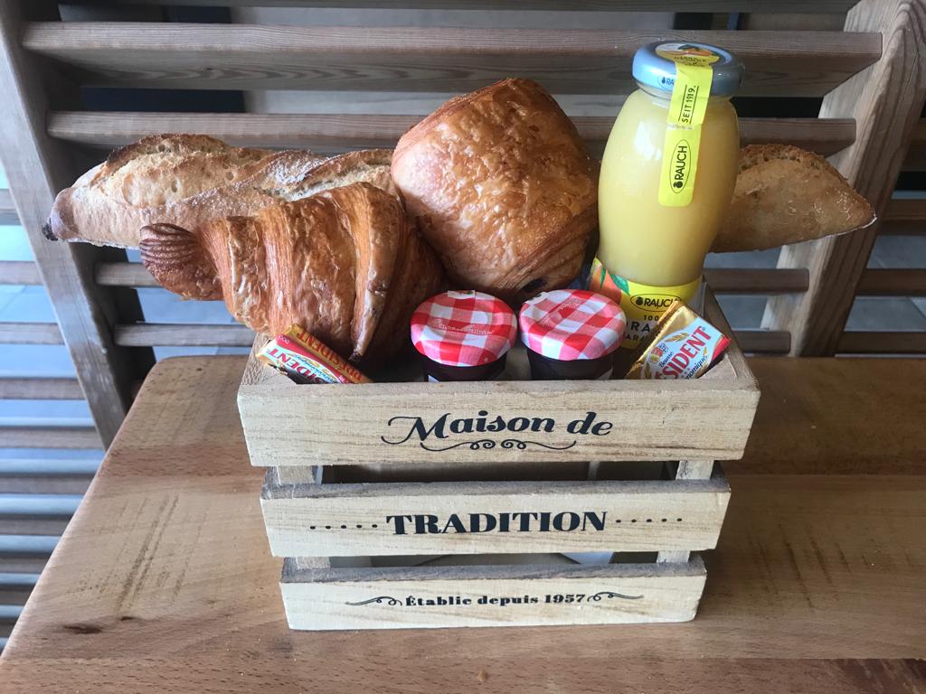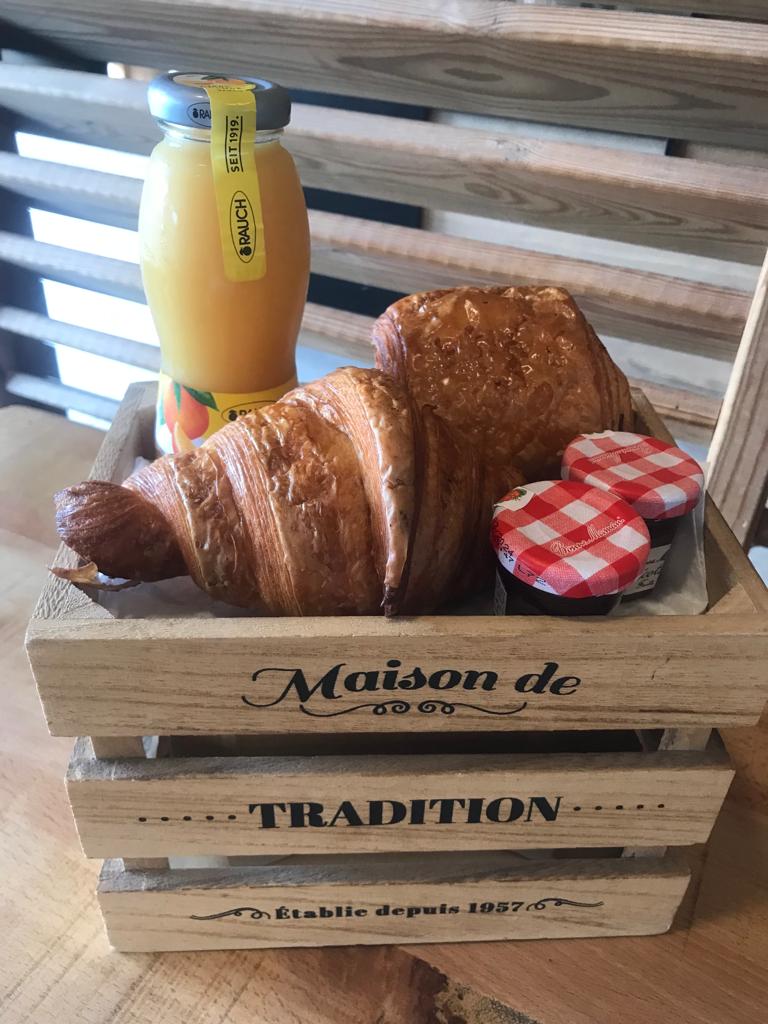 1/2 Baguette, 1 Quiche Lorraine, 1 Croissant ou 1 Pain chocolat 2 Butters, 2 Jams, 1 Juice