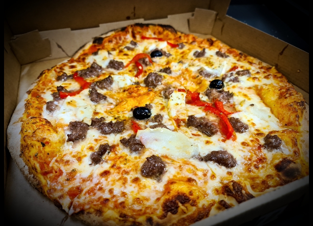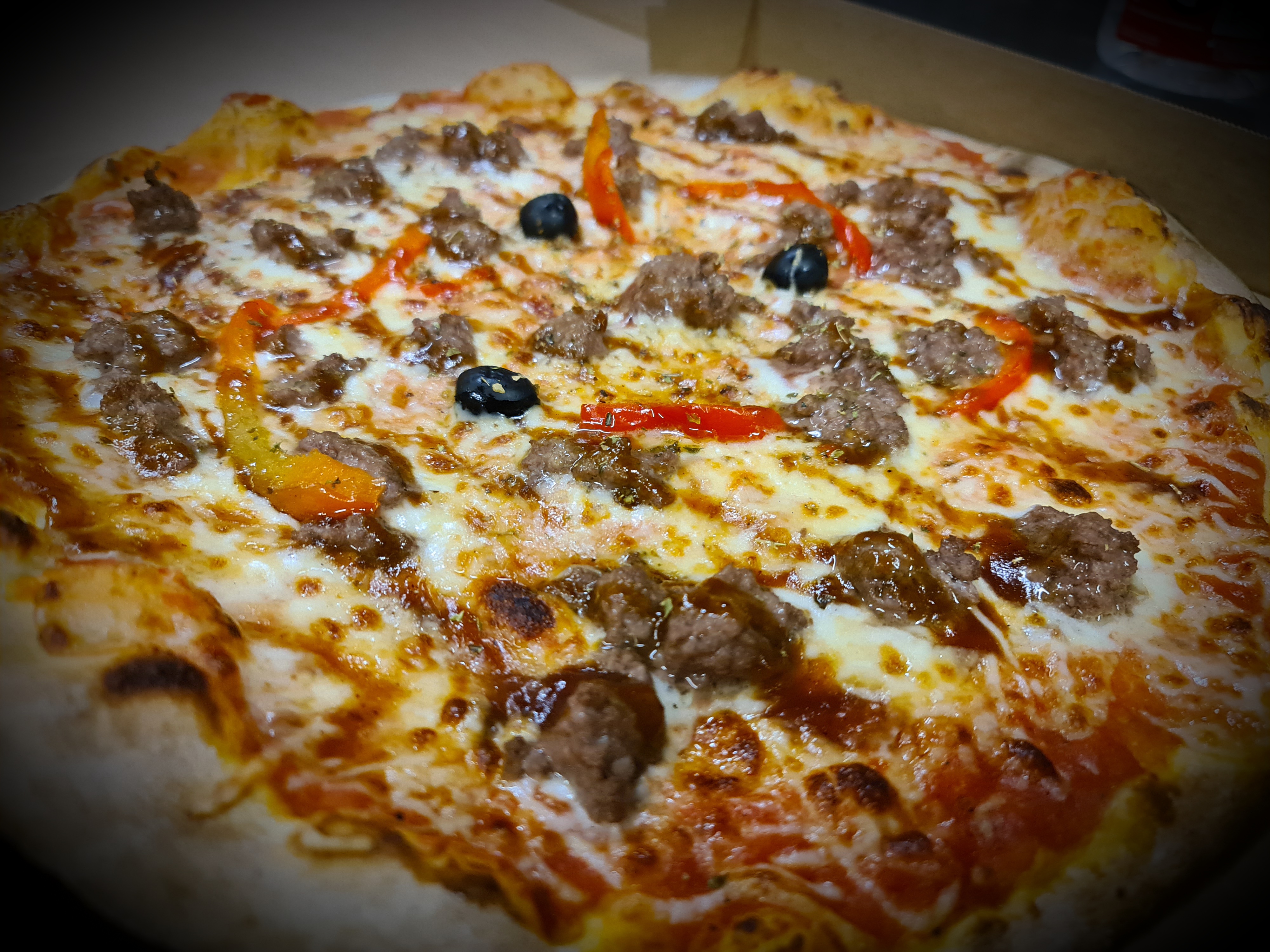 Tomato, Cheese, Minced Meat, Sweet Pepper, BBQ Sauce, Olive, Oregano