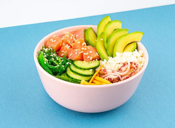 Soy marinated salmon, Japanese cabbage salad, Avocado, Red onion, Cherry tomatoes, Cucumbers, Kaz à Poke sauce, Sesame,…