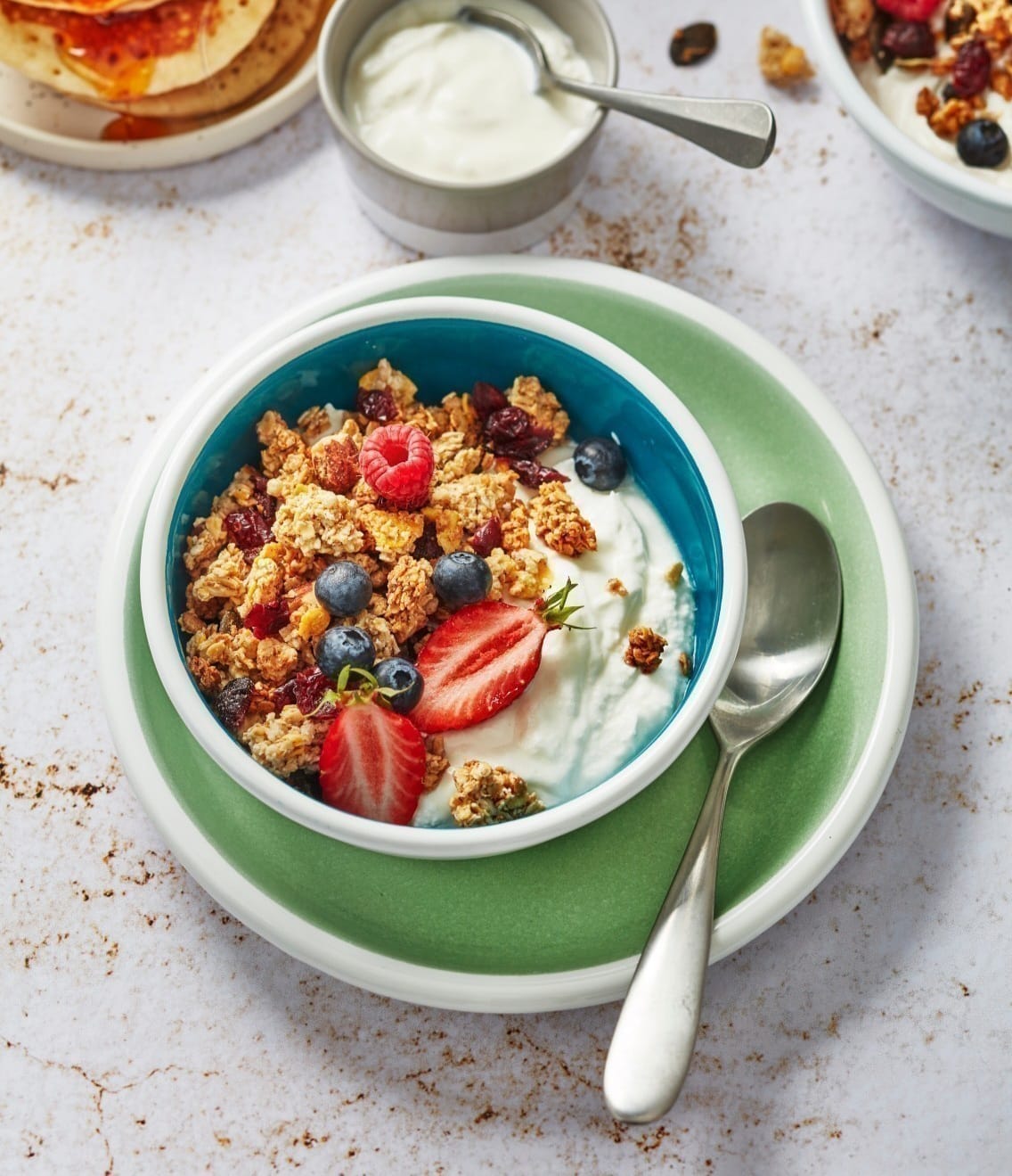 Greek yogurt, Fresh fruit, Whole muesli