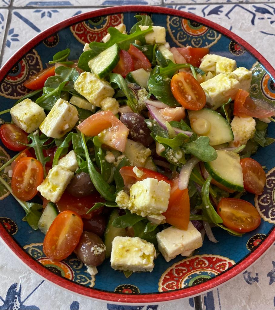 Marinated feta cheese mixed with spring mix, Cherry tomatoes, Dices tomatoes, Cucumber, Sweet