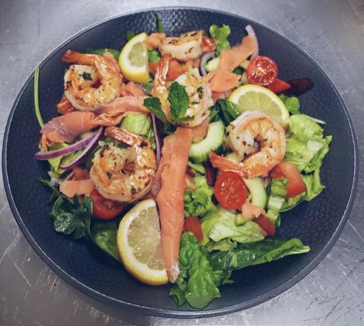 Smoked salmon, Boiled shrimps served on a bed of spring mix salad & cherry tomatoes