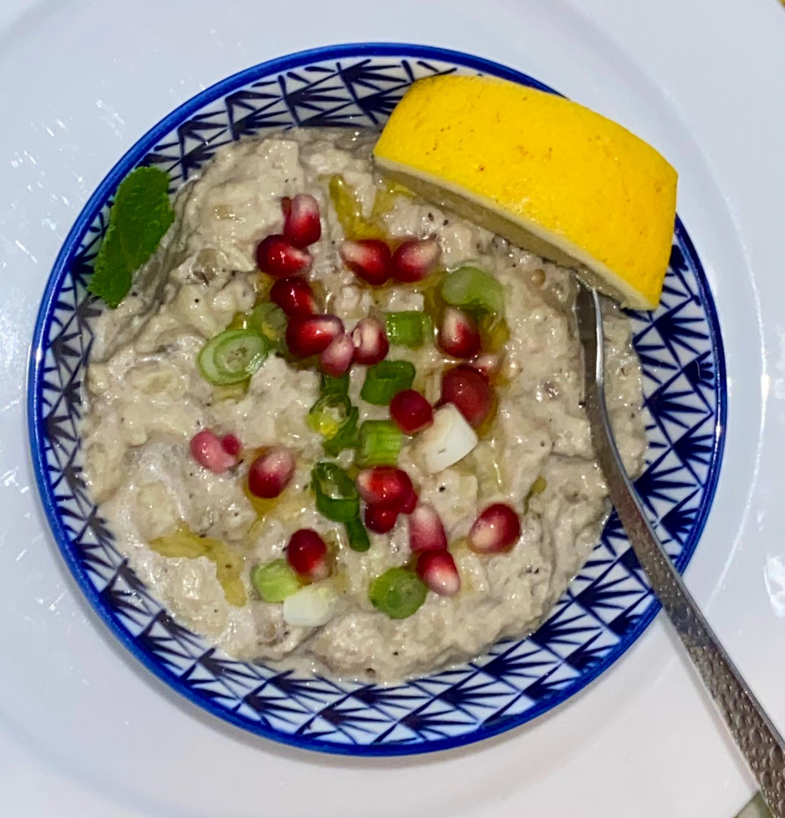 Roasted eggplant mixed with tahini, Lemon juice & olive oil