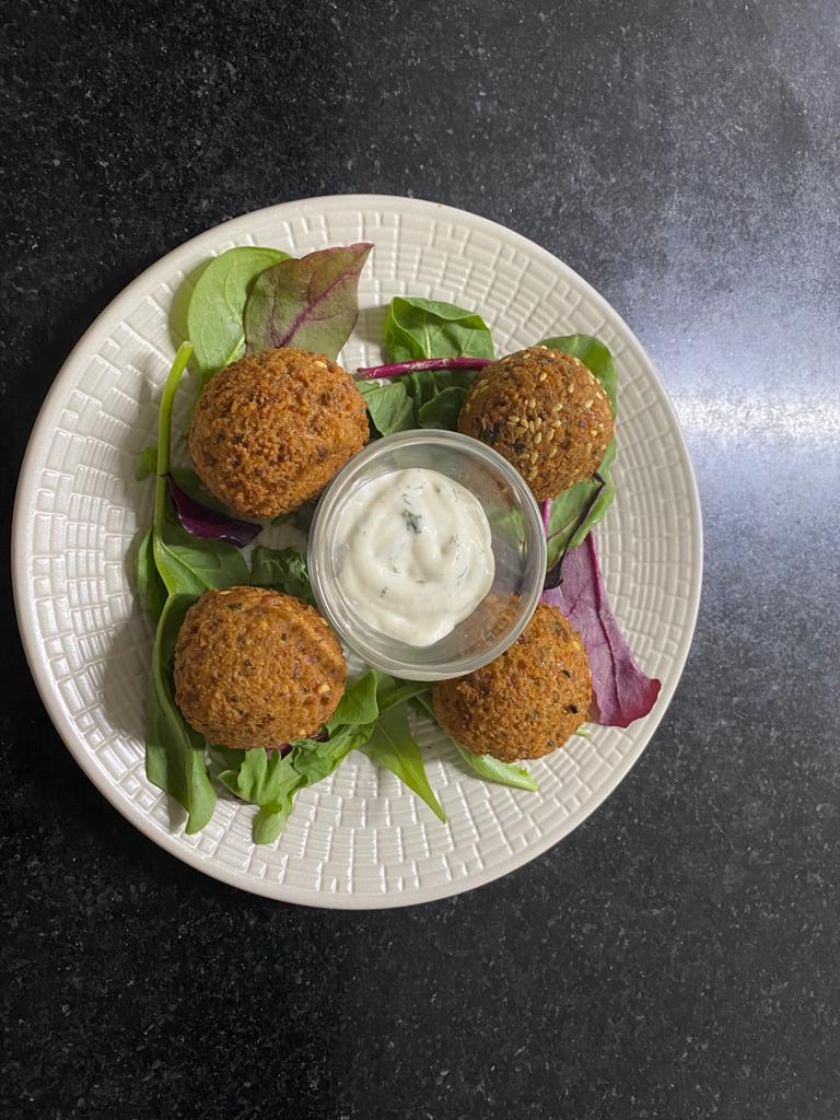 Mixture of freshly ground chickpeas, Fresh herbs and spices that are formed into balls which are deep fried