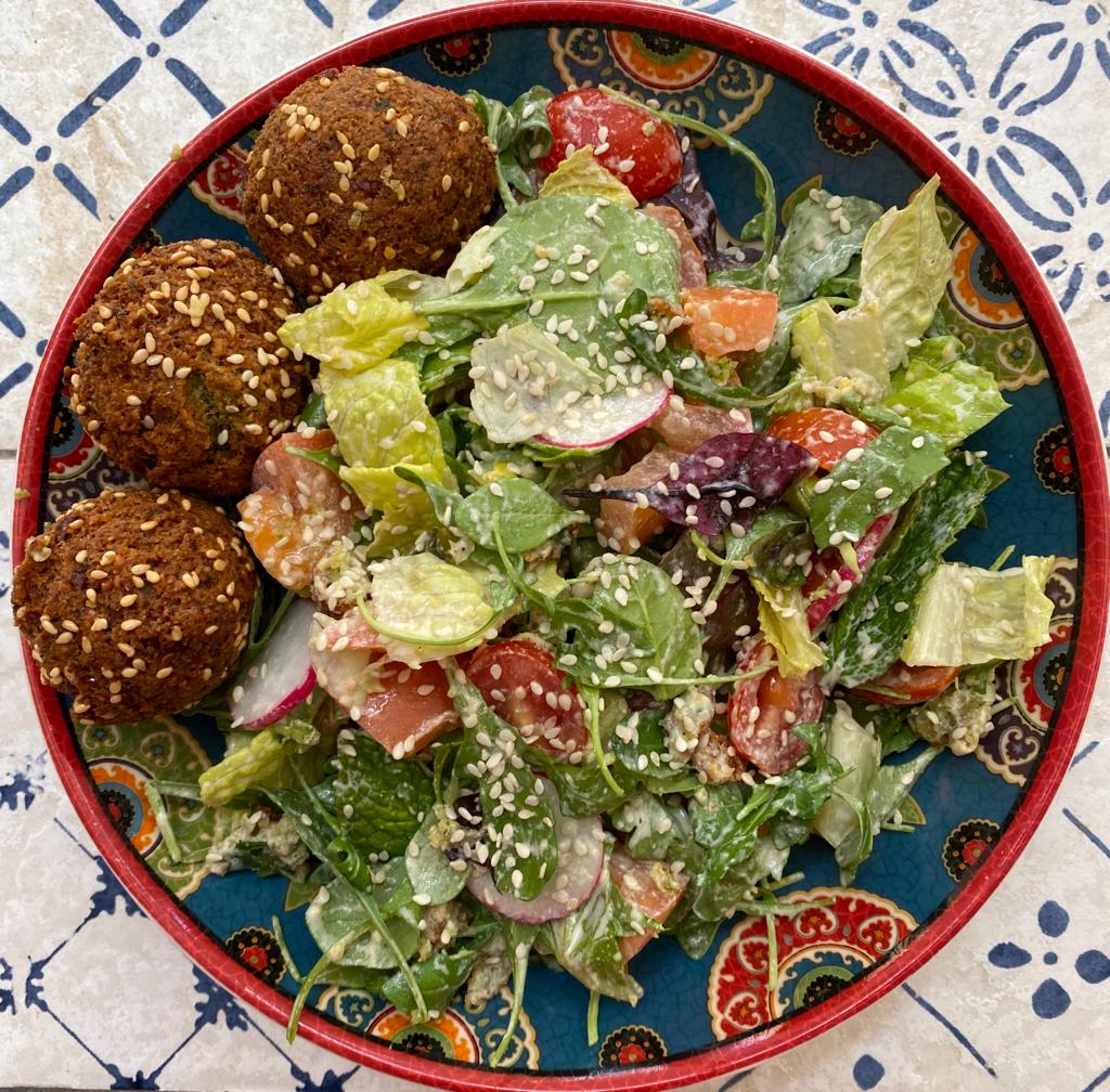 Broken falafels served on a bed of spring mix salad, Tomatoes, Radish and garnished with sesame seeds served with tarat…
