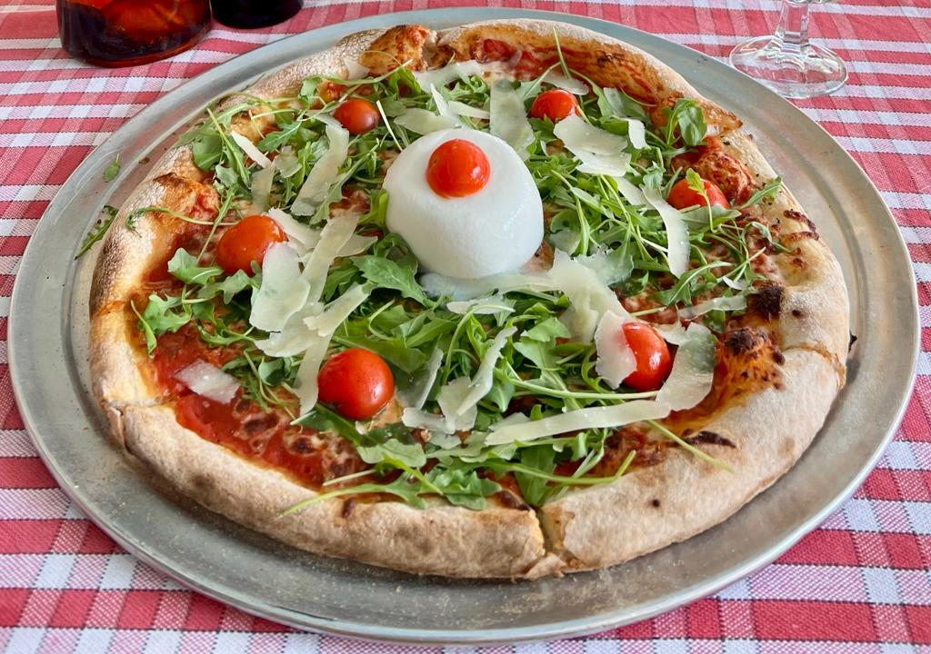 Marinara sauce, Mozzarella, Arugula, Cherry tomatoes, Burrata, Shaved Parmesan