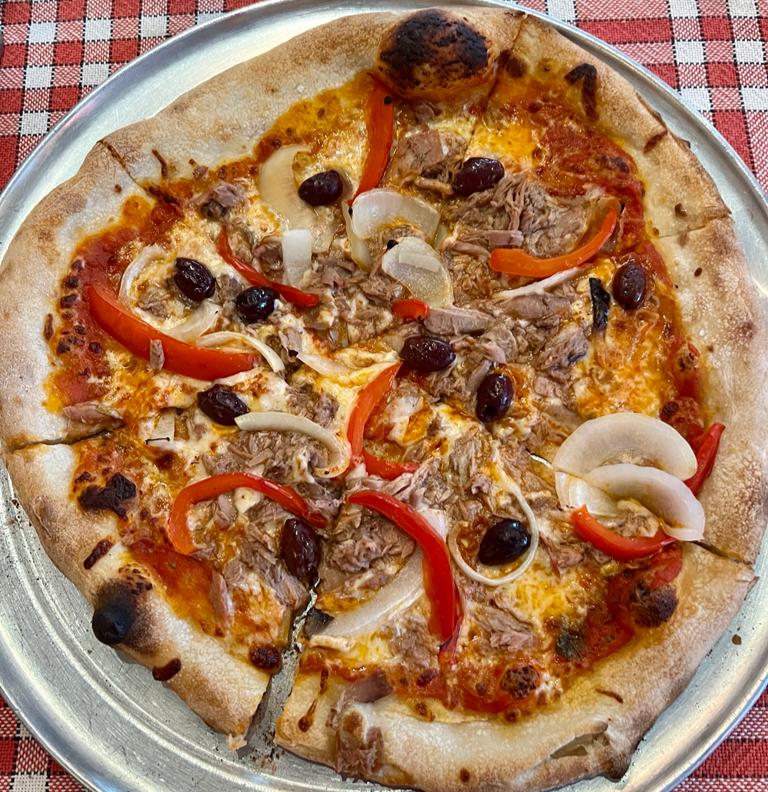 Marinara sauce, Mozzarella, Tuna, Sweet peppers, Onions, Olives