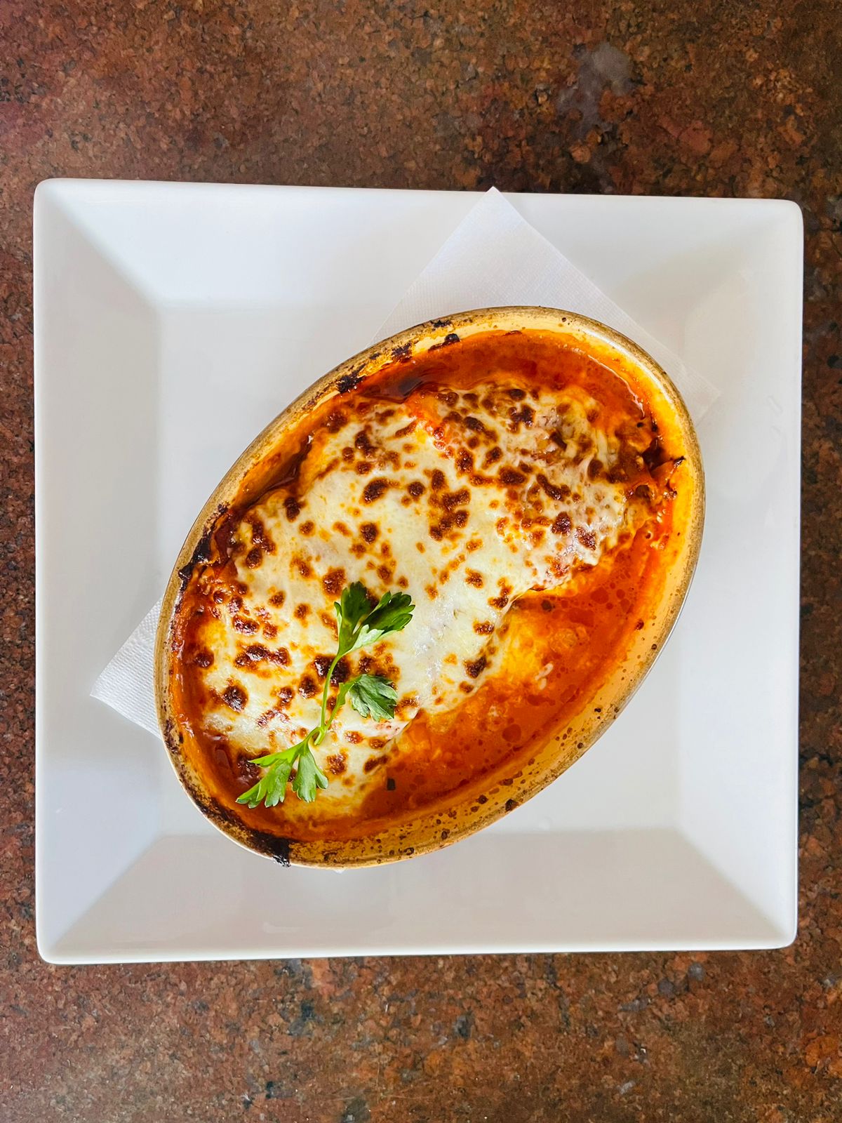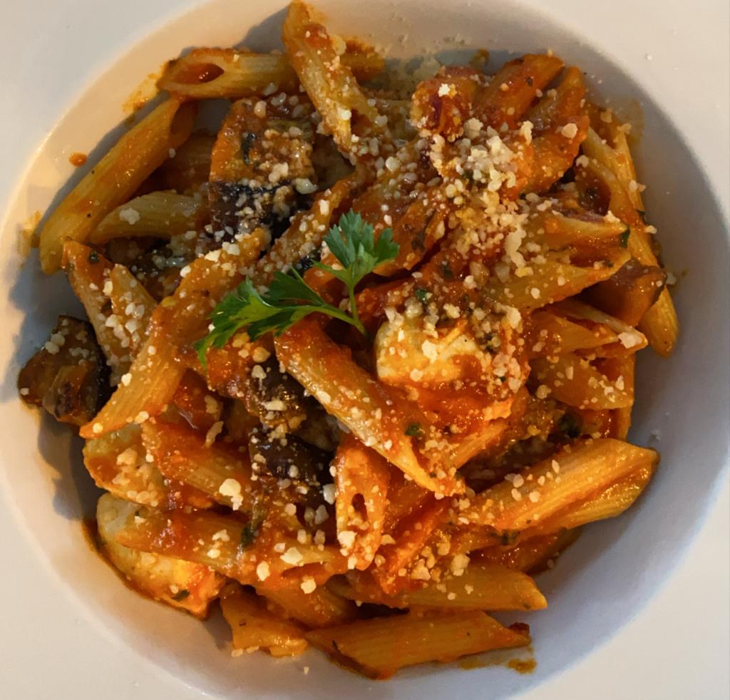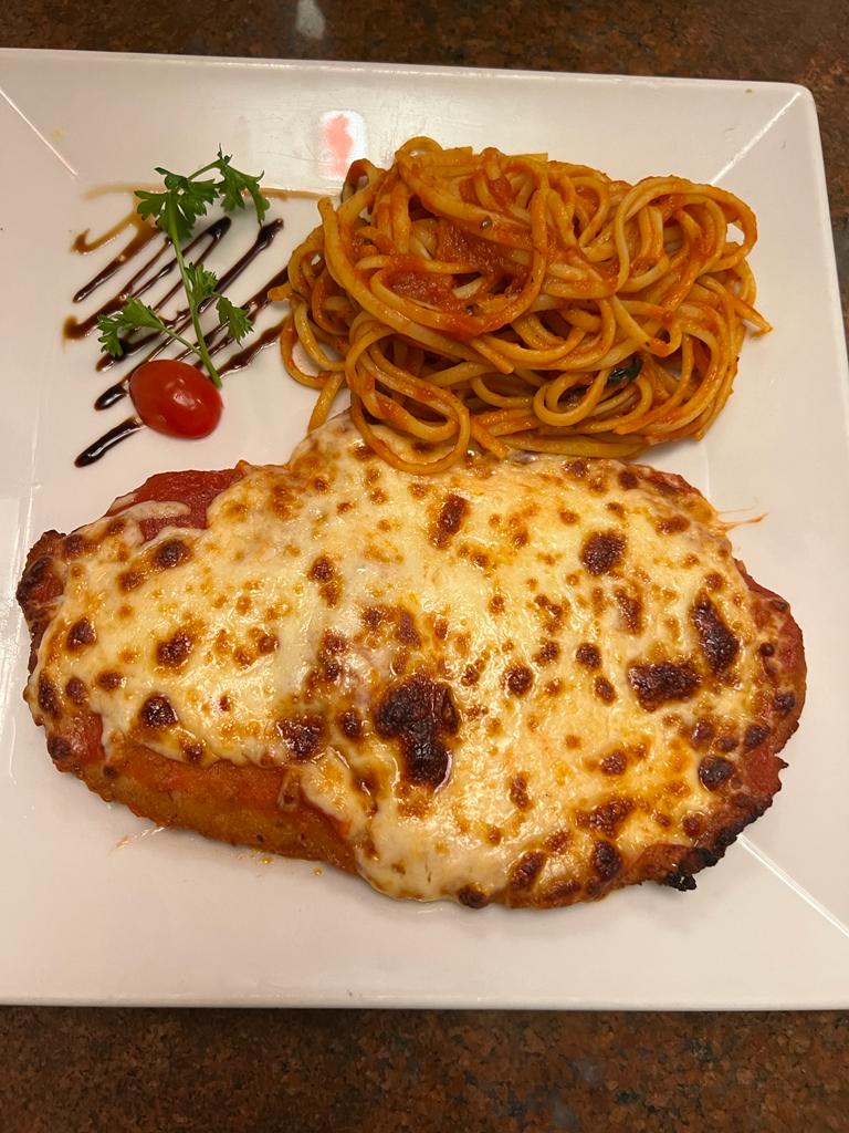 Breaded chicken breast with tomato sauce, Mozzarella, Parmesan, Grilled in the oven, Served with Tomato Pasta