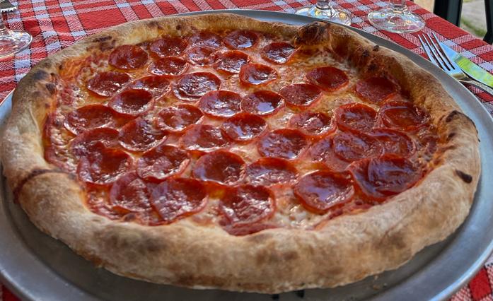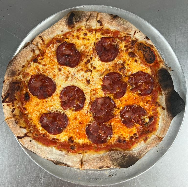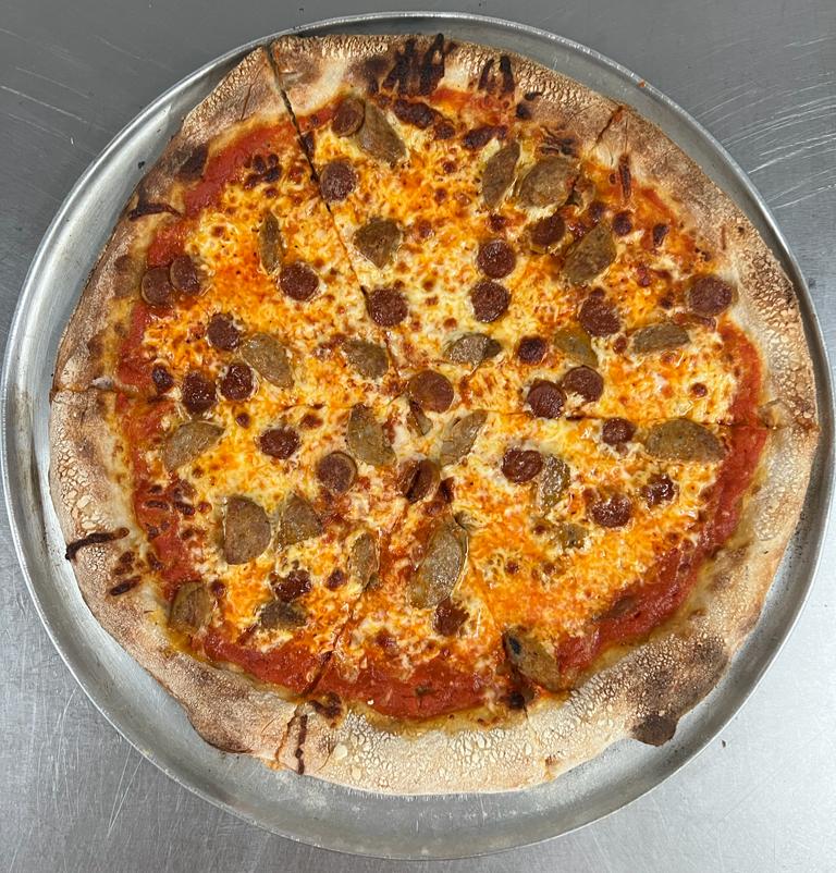 Marinara sauce, Mozzarella, Pepperonni, Spicy Italian sausage, Ham, Lardons