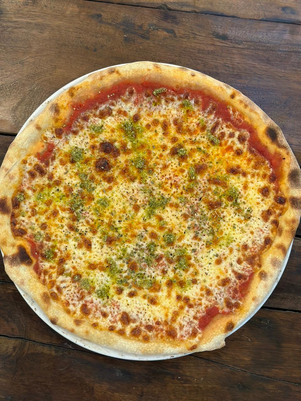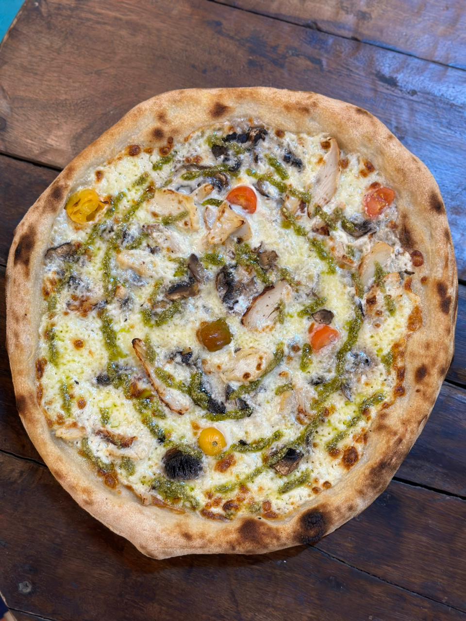 Tomato Sauce,Mozzarela, Pepperoni, Shrimps, Mushrooms, Pesto