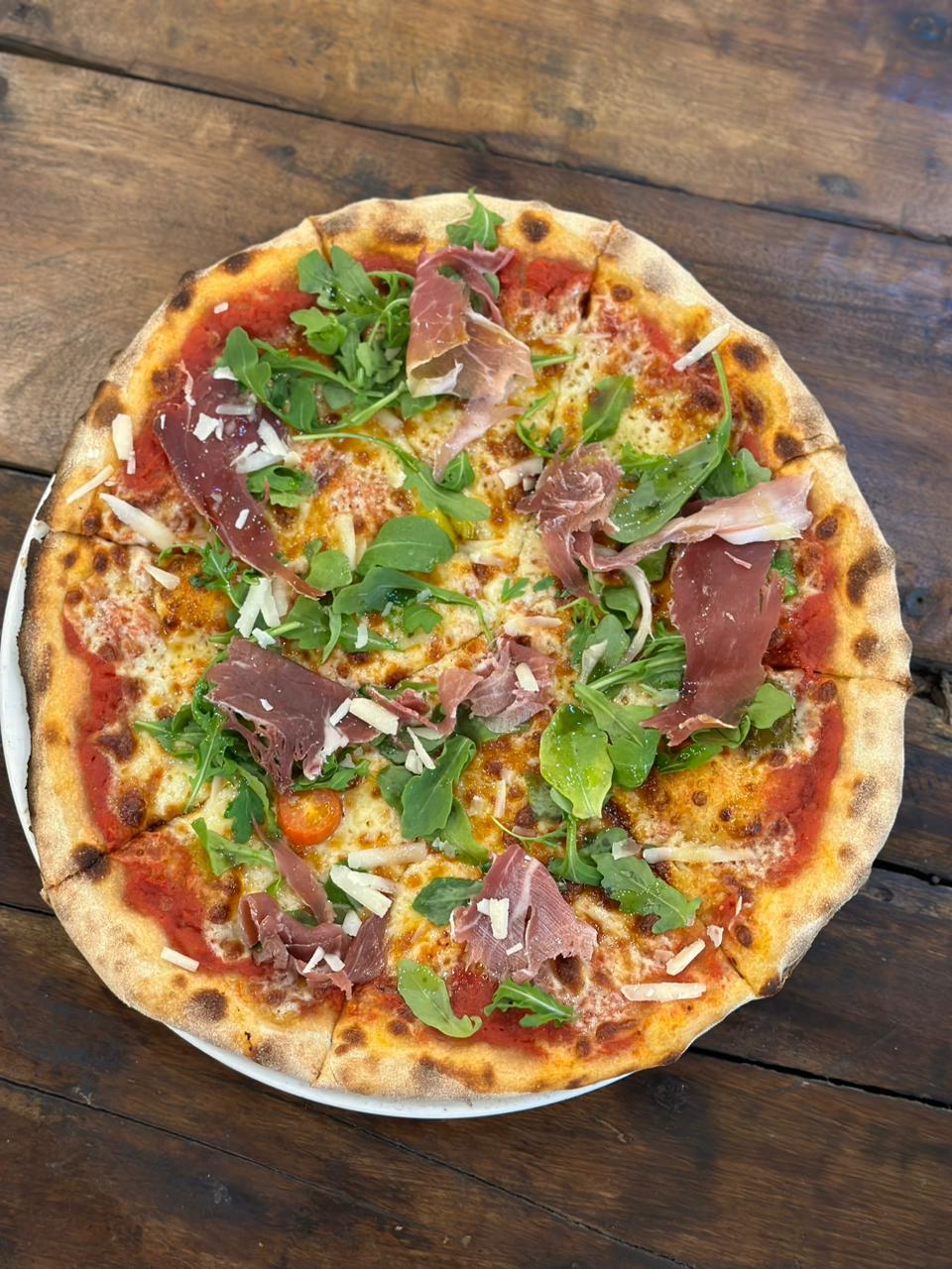 Tomato Sauce, Mozzarella, Raw Ham, Arugula, Cherry Tomatoes, Parmesan