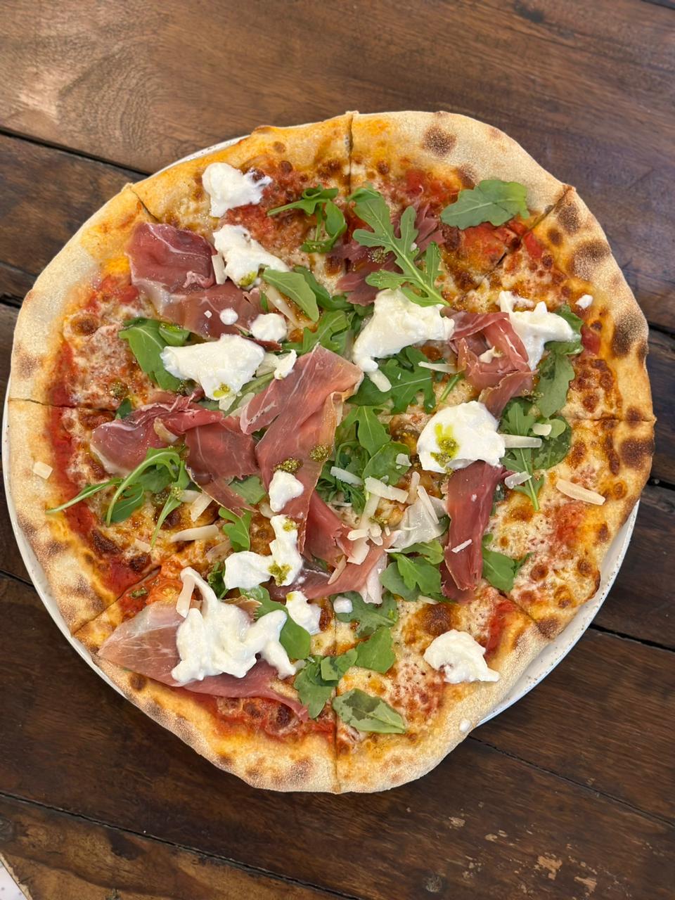 Tomato Sauce, Mozzarella, Burrata, Raw Ham, Cherry Tomatoes, Arugula, Parmesan