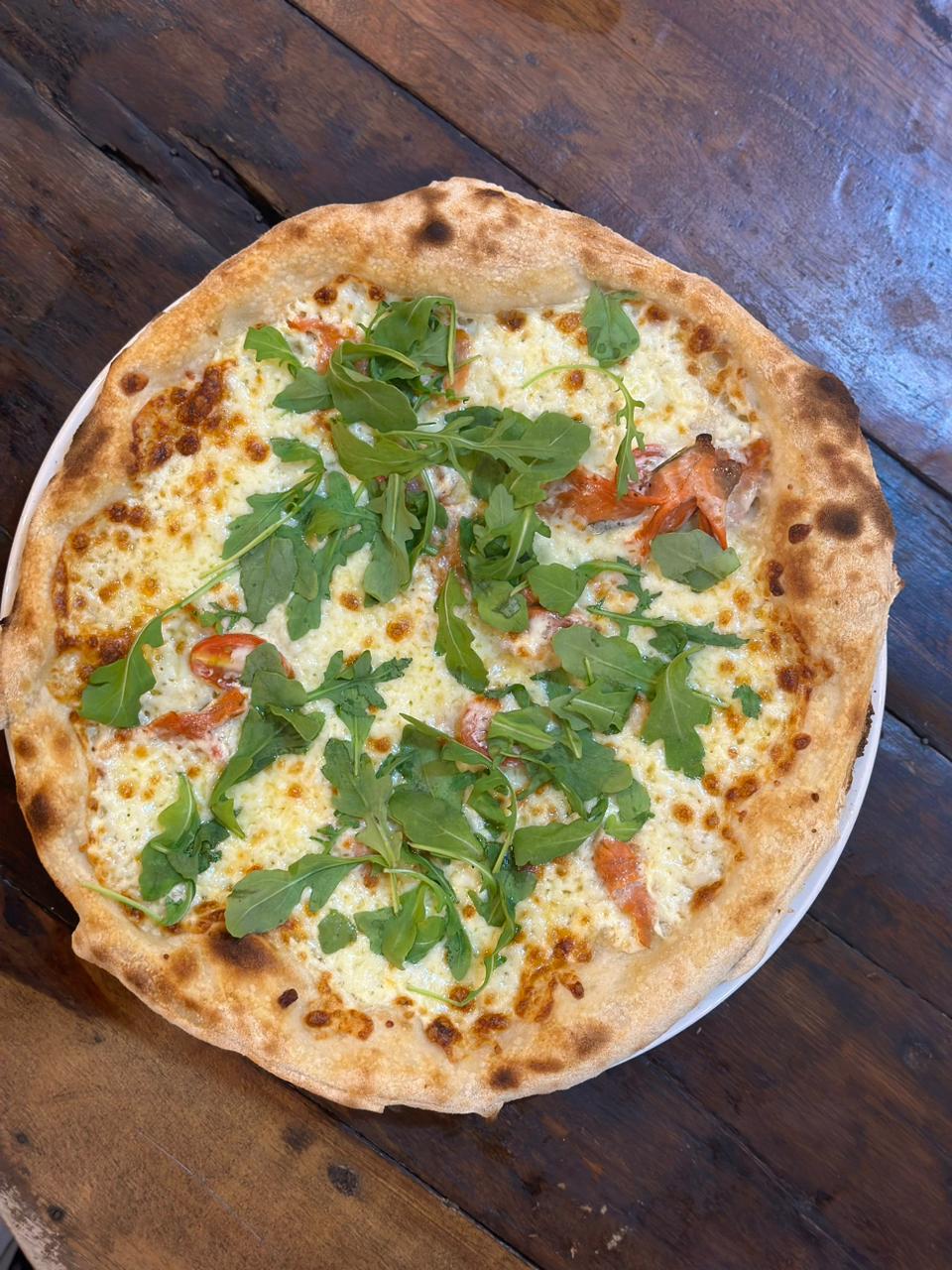 Cream, Mozzarella, Salmon, Cherry Tomatoes, Arugula Salad,