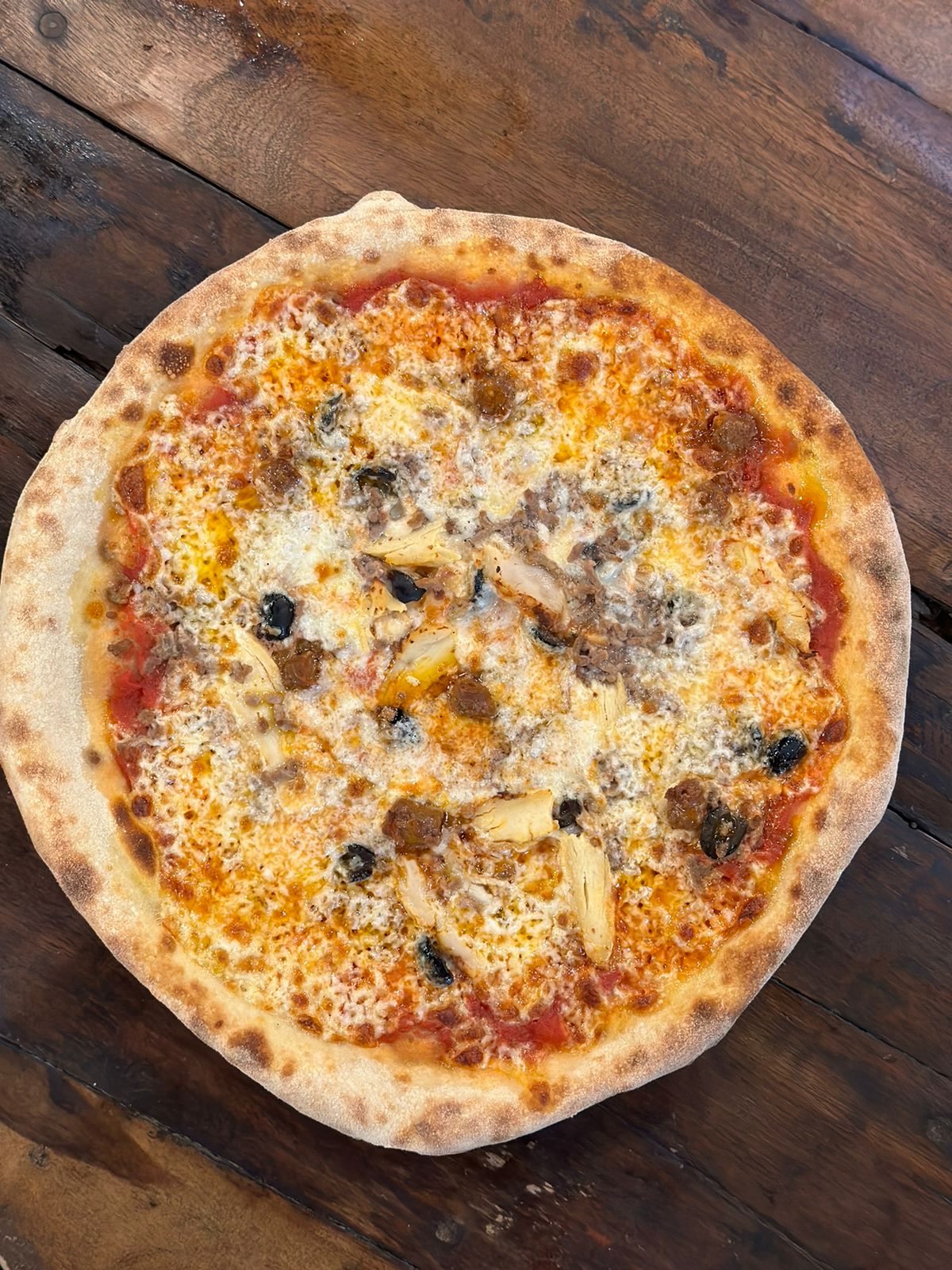 Tomato Sauce, Mozzarella, Chicken, Merguez, Minced Meat, Olives
