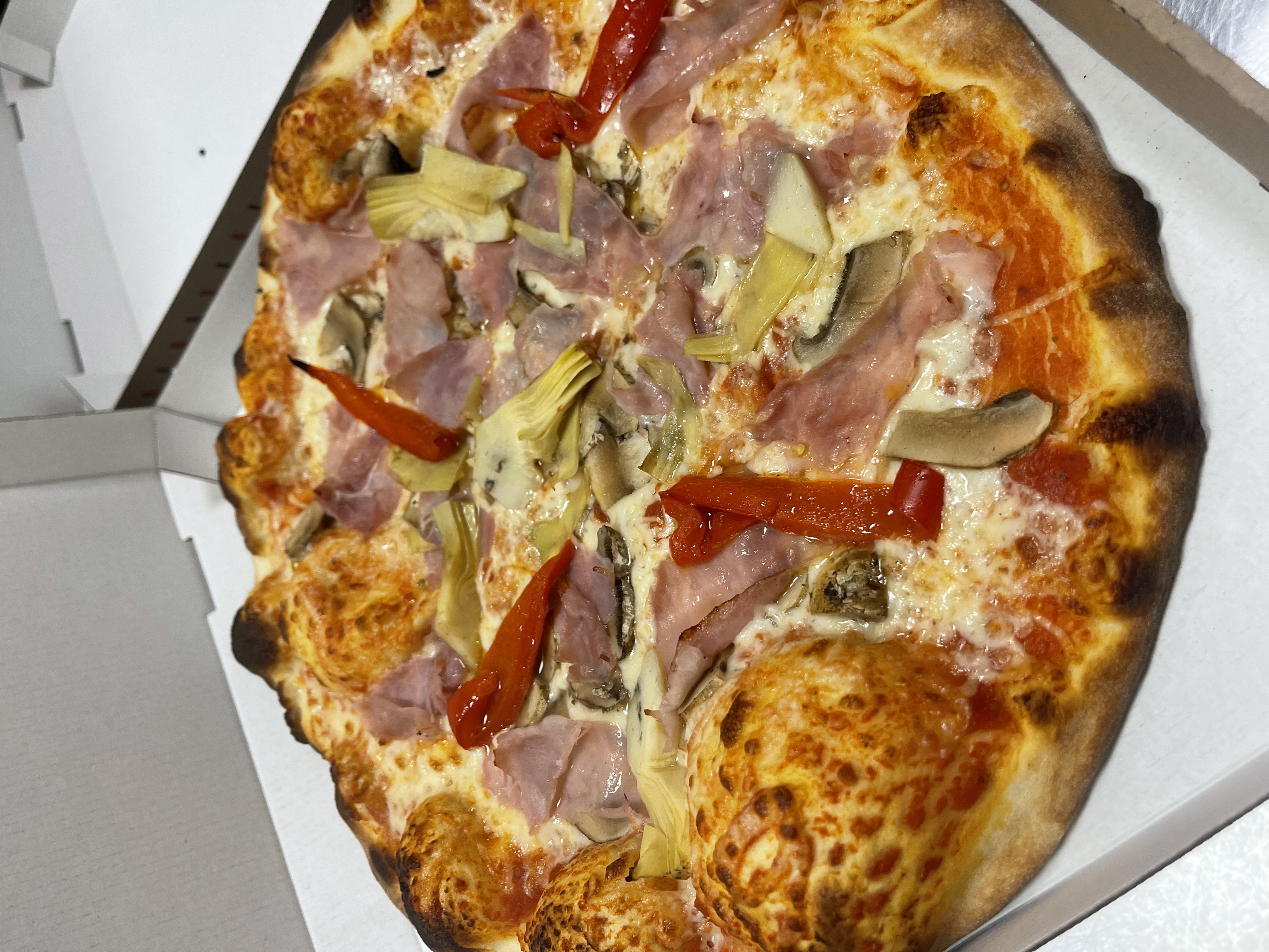 Tomato, cheese, mushrooms, ham, red pepper, artichokes
