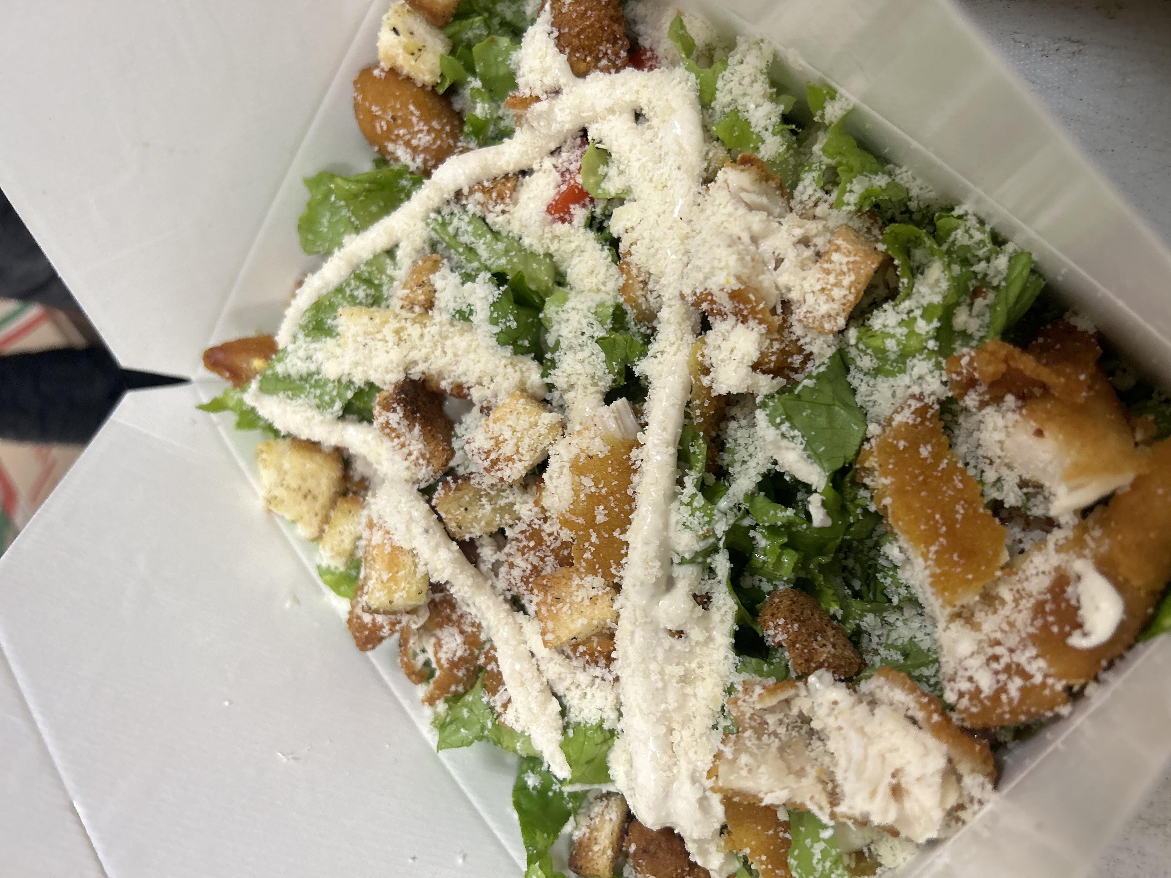 Salad, Breaded Chicken, Parmesan, Homemade Croutons, Homemade Caesar Sauce