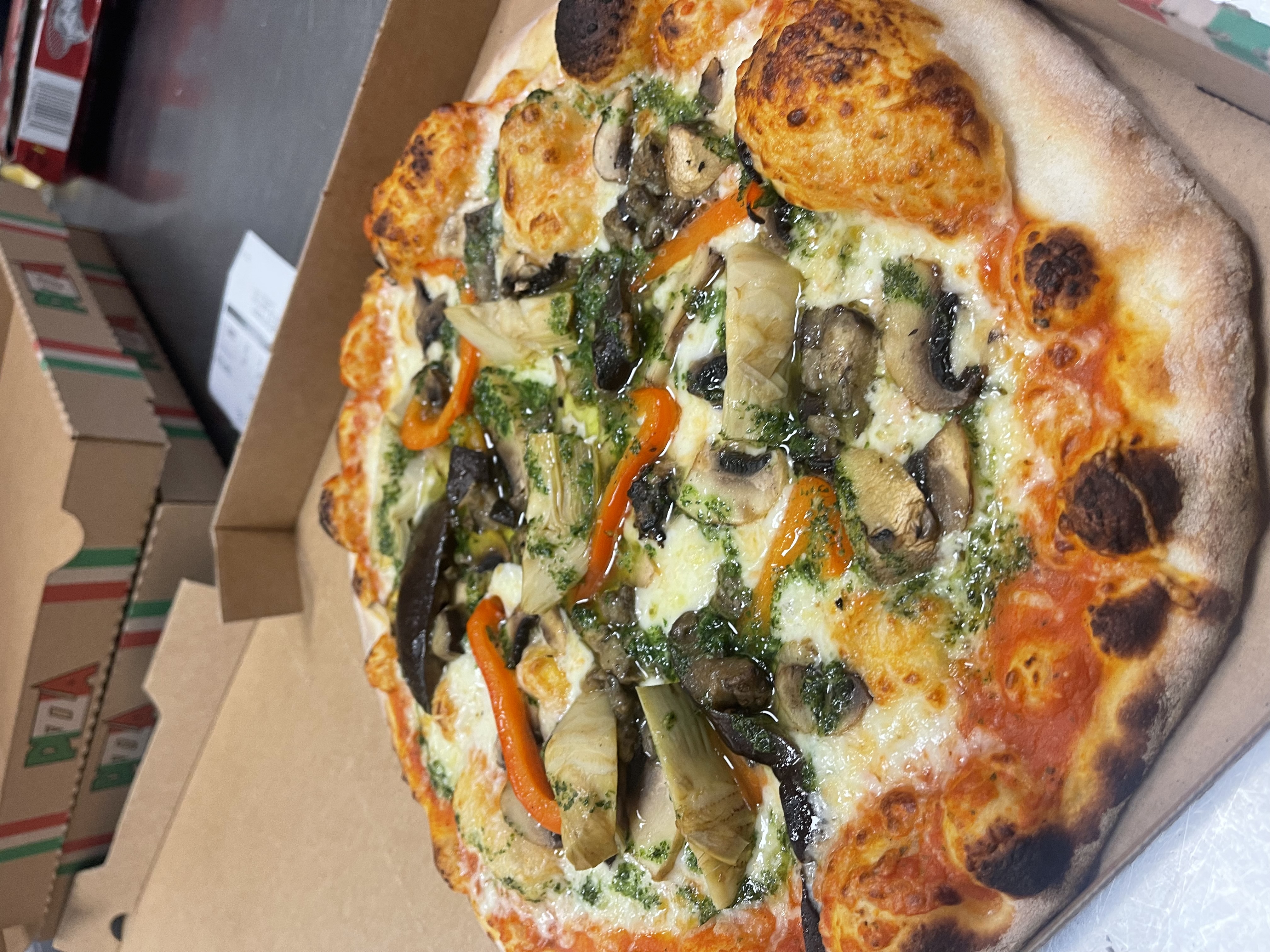 Tomato, cheese, mushrooms, artichokes, eggplant, red pepper, parsley and garlic sauce