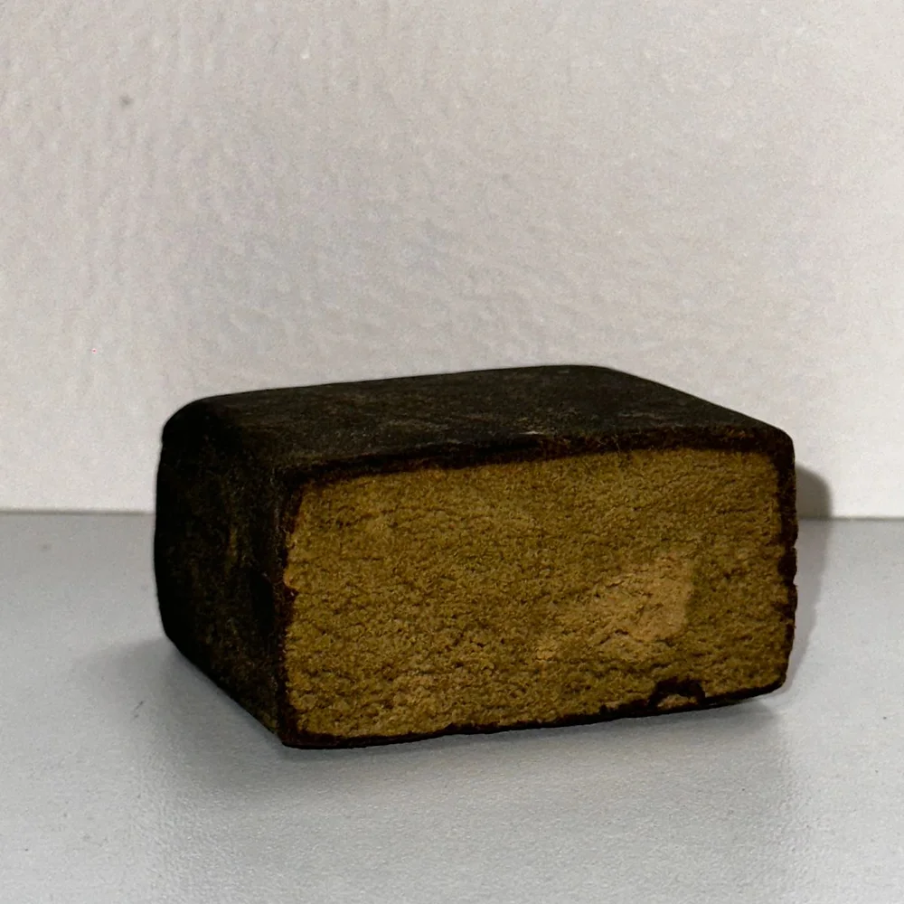 Le processus de presse bien particulier et précis du Marbré permet d'obtenir une résine ferme et foncée à l'extérieur, mais friable et jaune clair à l'intérieur.