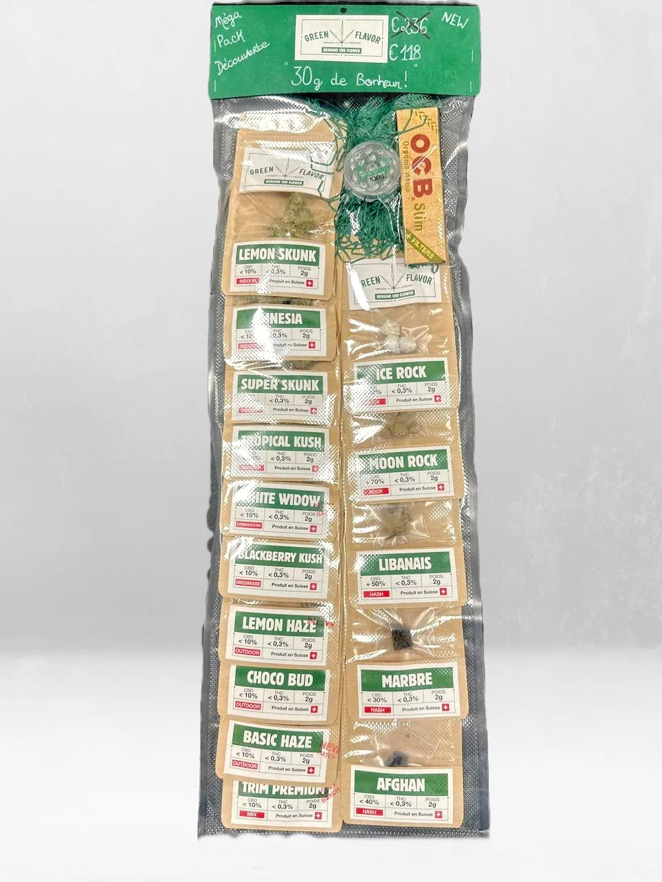 2g de Fleur de CBD Trim Premium, 2g de Fleur de CBD Basic Haze, 2g de Fleur de CBD Choco Bud, 2g de Fleur de CBD Lemon Haze, 2g de Fleur de CBD Gelato, 2g de Fleur de CBD Tropical Kush, 2g de Fleur de CBD Super Skunk, 2g de Fleur de CBD Amnesia, 2g de Fleur de CBD Lemon Skunk, 2g de Résine de CBD Marbre, 2g de Résine de CBD Afhgan, 2g de Résine de CBD Libanais, 2g de Moon Rock, 2g de Ice Rock, Un paquet de feuilles OCB, Un grinder Green Flavor SXM, Un briquet, Des filtres charbon réutilsables